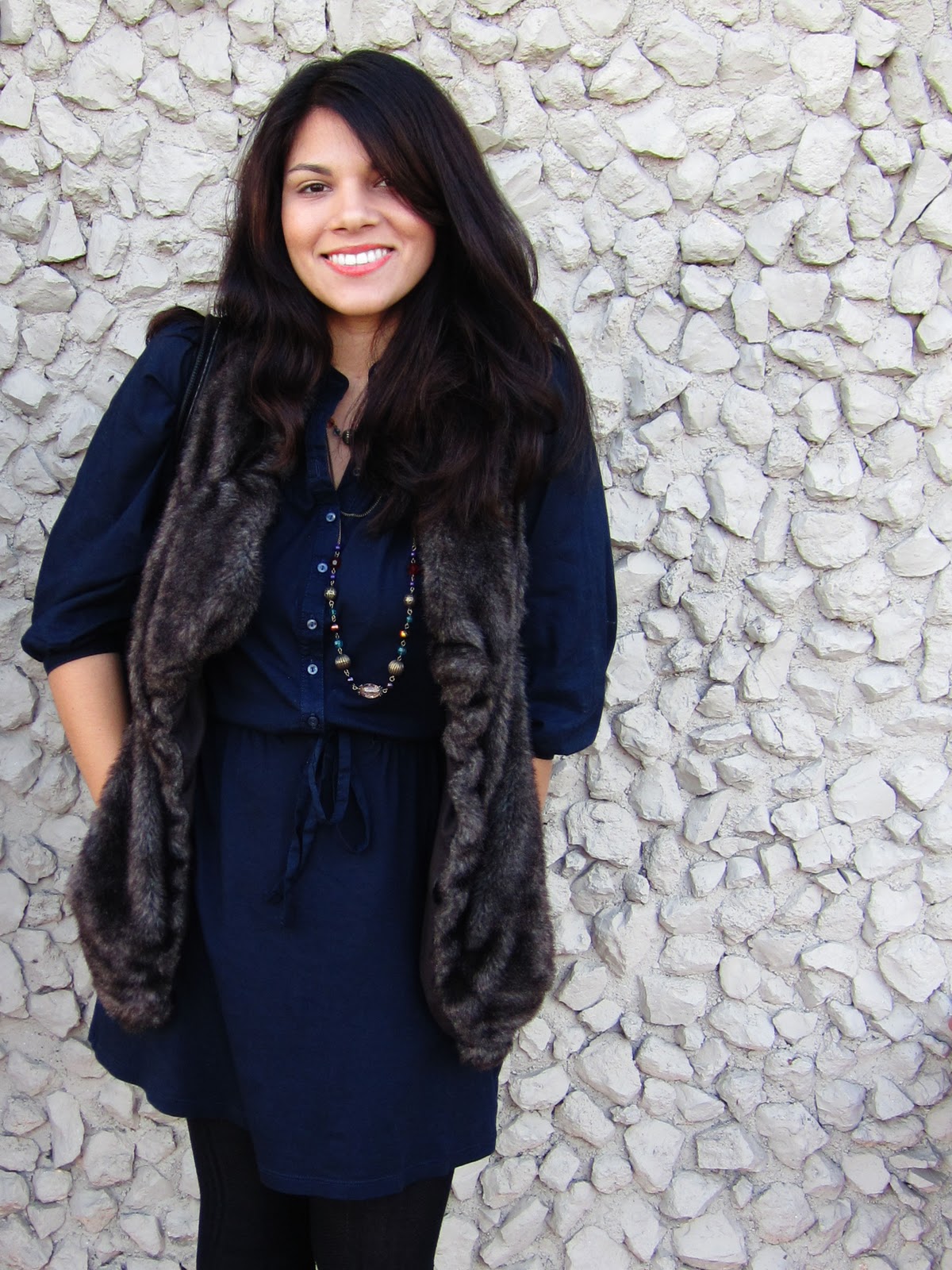 | Gap Dress/ Zara Faux Fur Vest/ Chinese Laundry Sweater Leggings/ Michael Antonio Heels/ B.Makowsky Bag/ Necklace, gifted |